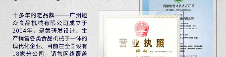 廣州旭眾食品機(jī)械有限公司是一家集科研開發(fā),生產(chǎn)設(shè)計(jì),營銷服務(wù)為一體的現(xiàn)代化生產(chǎn)企業(yè)。現(xiàn)代化生產(chǎn)車間,精湛制造技術(shù),所產(chǎn)機(jī)械歷經(jīng)市場重重考驗(yàn),不斷贏得海內(nèi)外客戶的贊譽(yù)。