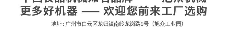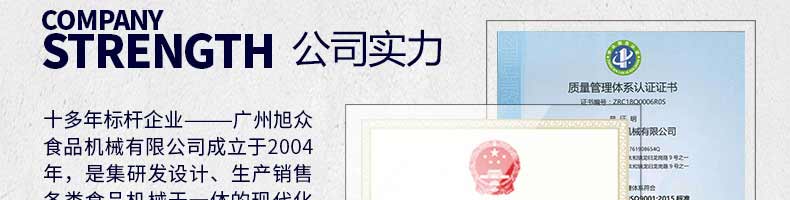廣州旭眾食品機(jī)械有限公司是一家集科研開發(fā),生產(chǎn)設(shè)計,營銷服務(wù)為一體的現(xiàn)代化生產(chǎn)企業(yè)。現(xiàn)代化生產(chǎn)車間,精湛制造技術(shù),所產(chǎn)機(jī)械歷經(jīng)市場重重考驗,不斷贏得海內(nèi)外客戶的贊譽(yù)。