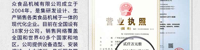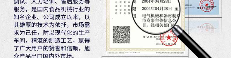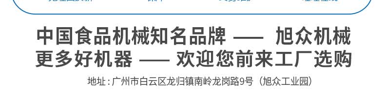 廣州旭眾食品機(jī)械有限公司是一家集科研開(kāi)發(fā),生產(chǎn)設(shè)計(jì),營(yíng)銷(xiāo)服務(wù)為一體的現(xiàn)代化生產(chǎn)企業(yè)。現(xiàn)代化生產(chǎn)車(chē)間,精湛制造技術(shù),所產(chǎn)機(jī)械歷經(jīng)市場(chǎng)重重考驗(yàn),不斷贏得海內(nèi)外客戶的贊譽(yù)。