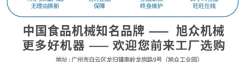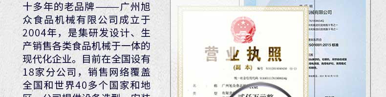廣州旭眾食品機械有限公司是一家集科研開發(fā),生產設計,營銷服務為一體的現代化生產企業(yè)。現代化生產車間,精湛制造技術,所產機械歷經市場重重考驗,不斷贏得海內外客戶的贊譽。