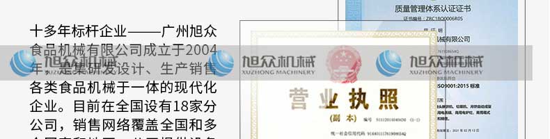 廣州旭眾食品機械有限公司是一家集科研開發(fā),生產(chǎn)設計,營銷服務為一體的現(xiàn)代化生產(chǎn)企業(yè)?,F(xiàn)代化生產(chǎn)車間,精湛制造技術,所產(chǎn)機械歷經(jīng)市場重重考驗,不斷贏得海內外客戶的贊譽。