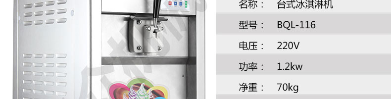BQL-116臺式冰淇淋機,●選用國際名牌成熟制冷配套件和高效壓縮機,融合旭眾精湛工藝輔以嚴格的質量控制流程,使產(chǎn)品整體性能及品質得以全面提升。●采用全數(shù)字電腦控制系統(tǒng),選用名牌優(yōu)質電器元件,先進的生產(chǎn)工藝,故障診斷,軟硬任意調(diào)制,自動修復功能,安全精確,可靠性更高。●專業(yè)成熟制冷系統(tǒng)設計,選用世界名牌大功率專用壓縮機,大大縮短冰淇淋成型時間,相同時間內(nèi)冰淇淋產(chǎn)量大幅度增加,使您生意火爆時依然得心應手,為您創(chuàng)造財富。●安全平穩(wěn)的機械攪拌系統(tǒng),噪音更低、振動更小,使整機運行性能達到國際先進水平。●確保進料溫度在0°C~35°C;環(huán)境溫度5°C~40°C勻可正常使用。
