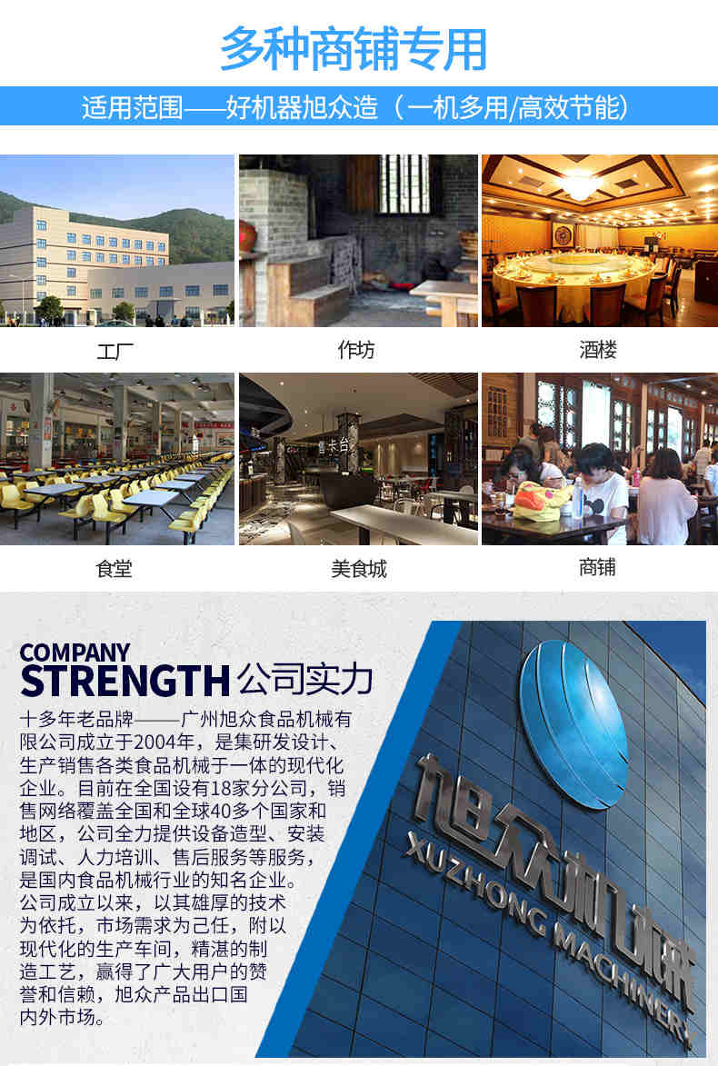 廣州旭眾食品機(jī)械有限公司是一家集科研開發(fā),生產(chǎn)設(shè)計,營銷服務(wù)為一體的現(xiàn)代化生產(chǎn)企業(yè)。現(xiàn)代化生產(chǎn)車間,精湛制造技術(shù),所產(chǎn)機(jī)械歷經(jīng)市場重重考驗,不斷贏得海內(nèi)外客戶的贊譽(yù)。