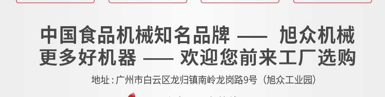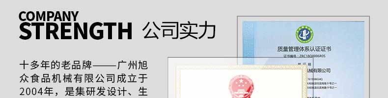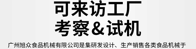 廣州旭眾食品機(jī)械有限公司是一家集科研開發(fā),生產(chǎn)設(shè)計(jì),營銷服務(wù)為一體的現(xiàn)代化生產(chǎn)企業(yè)。現(xiàn)代化生產(chǎn)車間,精湛制造技術(shù),所產(chǎn)機(jī)械歷經(jīng)市場重重考驗(yàn),不斷贏得海內(nèi)外客戶的贊譽(yù)。