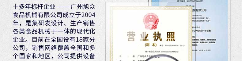 廣州旭眾食品機械有限公司是一家集科研開發(fā),生產(chǎn)設(shè)計,營銷服務(wù)為一體的現(xiàn)代化生產(chǎn)企業(yè)?,F(xiàn)代化生產(chǎn)車間,精湛制造技術(shù),所產(chǎn)機械歷經(jīng)市場重重考驗,不斷贏得海內(nèi)外客戶的贊譽。