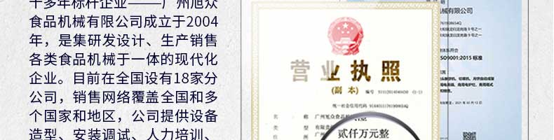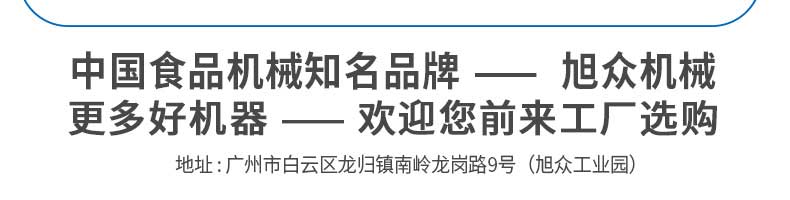 廣州旭眾食品機(jī)械有限公司是一家集科研開(kāi)發(fā),生產(chǎn)設(shè)計(jì),營(yíng)銷服務(wù)為一體的現(xiàn)代化生產(chǎn)企業(yè)?,F(xiàn)代化生產(chǎn)車間,精湛制造技術(shù),所產(chǎn)機(jī)械歷經(jīng)市場(chǎng)重重考驗(yàn),不斷贏得海內(nèi)外客戶的贊譽(yù)。