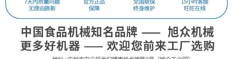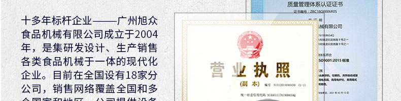 廣州旭眾食品機(jī)械有限公司是一家集科研開發(fā),生產(chǎn)設(shè)計,營銷服務(wù)為一體的現(xiàn)代化生產(chǎn)企業(yè)。現(xiàn)代化生產(chǎn)車間,精湛制造技術(shù),所產(chǎn)機(jī)械歷經(jīng)市場重重考驗(yàn),不斷贏得海內(nèi)外客戶的贊譽(yù)。