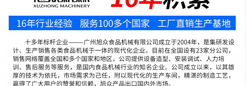 廣州旭眾食品機(jī)械有限公司是一家集科研開發(fā),生產(chǎn)設(shè)計,營銷服務(wù)為一體的現(xiàn)代化生產(chǎn)企業(yè)。現(xiàn)代化生產(chǎn)車間,精湛制造技術(shù),所產(chǎn)機(jī)械歷經(jīng)市場重重考驗(yàn),不斷贏得海內(nèi)外客戶的贊譽(yù)。