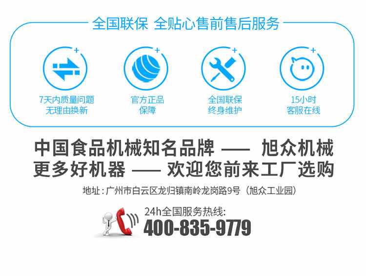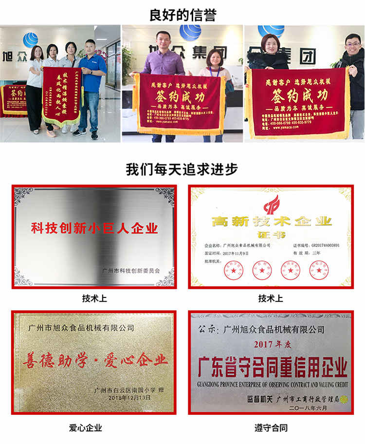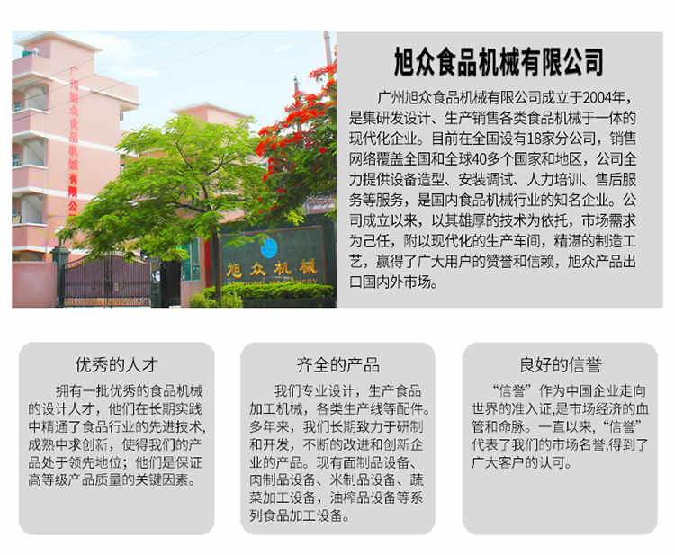 廣州旭眾食品機(jī)械有限公司是一家集科研開發(fā),生產(chǎn)設(shè)計(jì),營(yíng)銷服務(wù)為一體的現(xiàn)代化生產(chǎn)企業(yè)?,F(xiàn)代化生產(chǎn)車間,精湛制造技術(shù),所產(chǎn)機(jī)械歷經(jīng)市場(chǎng)重重考驗(yàn),不斷贏得海內(nèi)外客戶的贊譽(yù)。