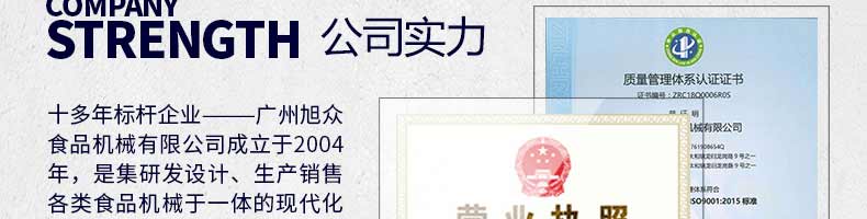廣州旭眾食品機械有限公司是一家集科研開發(fā),生產(chǎn)設(shè)計,營銷服務(wù)為一體的現(xiàn)代化生產(chǎn)企業(yè)。現(xiàn)代化生產(chǎn)車間,精湛制造技術(shù),所產(chǎn)機械歷經(jīng)市場重重考驗,不斷贏得海內(nèi)外客戶的贊譽。