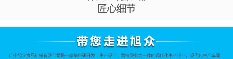 廣州旭眾食品機(jī)械有限公司是一家集科研開發(fā),生產(chǎn)設(shè)計,營銷服務(wù)為一體的現(xiàn)代化生產(chǎn)企業(yè)?,F(xiàn)代化生產(chǎn)車間,精湛制造技術(shù),所產(chǎn)機(jī)械歷經(jīng)市場重重考驗,不斷贏得海內(nèi)外客戶的贊譽。