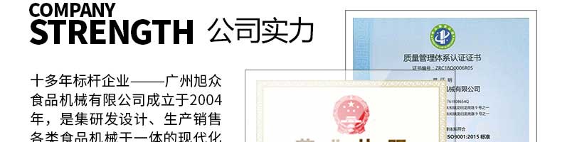 廣州旭眾食品機(jī)械有限公司是一家集科研開(kāi)發(fā),生產(chǎn)設(shè)計(jì),營(yíng)銷(xiāo)服務(wù)為一體的現(xiàn)代化生產(chǎn)企業(yè)?,F(xiàn)代化生產(chǎn)車(chē)間,精湛制造技術(shù),所產(chǎn)機(jī)械歷經(jīng)市場(chǎng)重重考驗(yàn),不斷贏得海內(nèi)外客戶的贊譽(yù)。