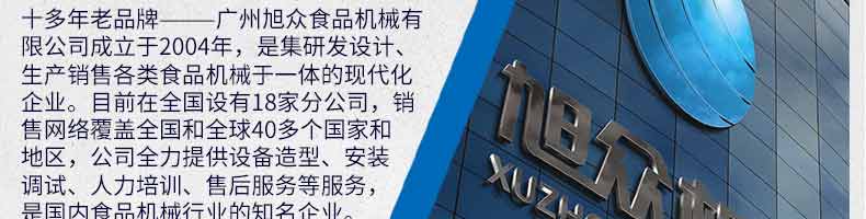 廣州旭眾食品機械有限公司是一家集科研開發(fā),生產(chǎn)設(shè)計,營銷服務(wù)為一體的現(xiàn)代化生產(chǎn)企業(yè)?,F(xiàn)代化生產(chǎn)車間,精湛制造技術(shù),所產(chǎn)機械歷經(jīng)市場重重考驗,不斷贏得海內(nèi)外客戶的贊譽。
