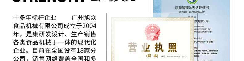 廣州旭眾食品機(jī)械有限公司是一家集科研開發(fā),生產(chǎn)設(shè)計(jì),營銷服務(wù)為一體的現(xiàn)代化生產(chǎn)企業(yè)。現(xiàn)代化生產(chǎn)車間,精湛制造技術(shù),所產(chǎn)機(jī)械歷經(jīng)市場重重考驗(yàn),不斷贏得海內(nèi)外客戶的贊譽(yù)。
