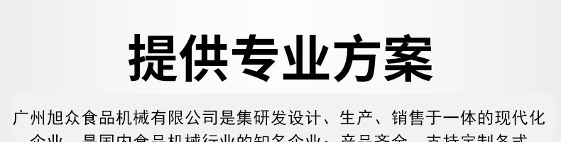 廣州旭眾食品機械有限公司是一家集科研開發(fā),生產設計,營銷服務為一體的現(xiàn)代化生產企業(yè)?,F(xiàn)代化生產車間,精湛制造技術,所產機械歷經市場重重考驗,不斷贏得海內外客戶的贊譽。