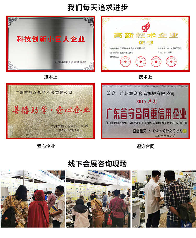 廣州旭眾食品機械有限公司是一家集科研開發(fā),生產設計,營銷服務為一體的現(xiàn)代化生產企業(yè)?,F(xiàn)代化生產車間,精湛制造技術,所產機械歷經市場重重考驗,不斷贏得海內外客戶的贊譽。