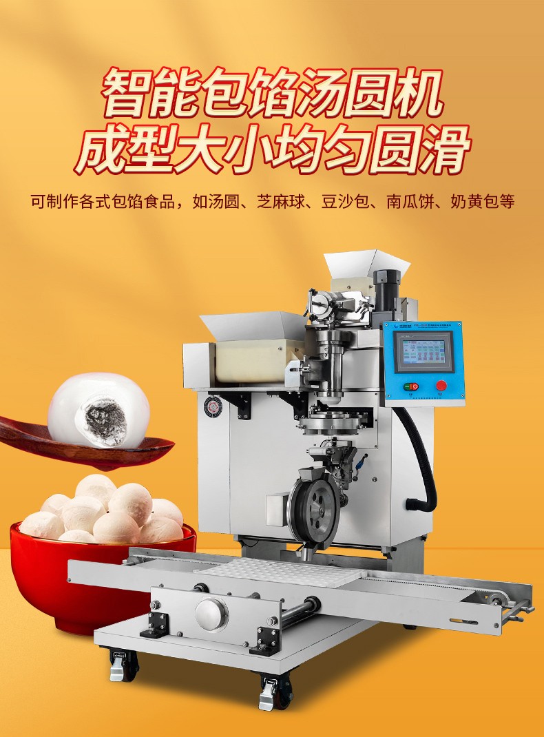 ◆送面、送餡均采用四絞龍結(jié)構(gòu),數(shù)字變頻調(diào)控,可任意調(diào)節(jié)面、餡輸送量及湯圓重量??勺詣哟陥A、成型,制品不易變形