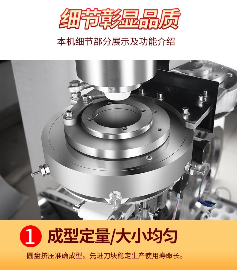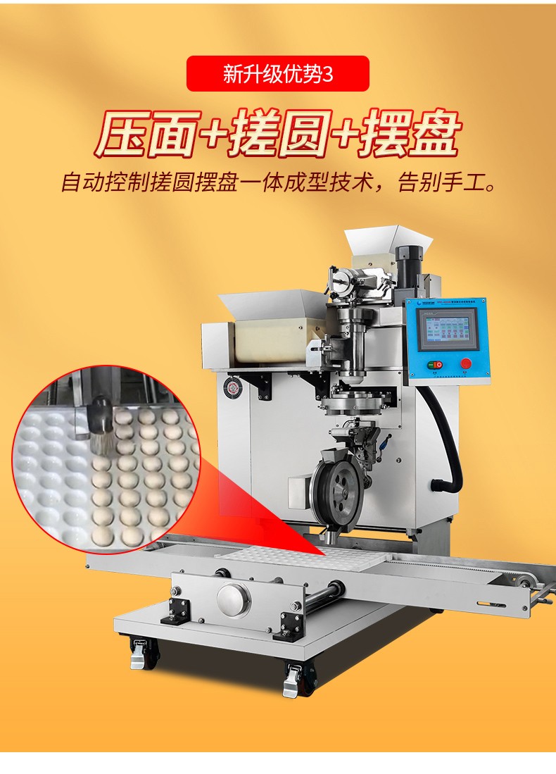 ◆觸摸屏自動控制搓圓擺盤一體成型技術(shù),使得制品外形美觀,大小均勻,表面光亮細(xì)膩、口感柔滑,彈韌性佳。