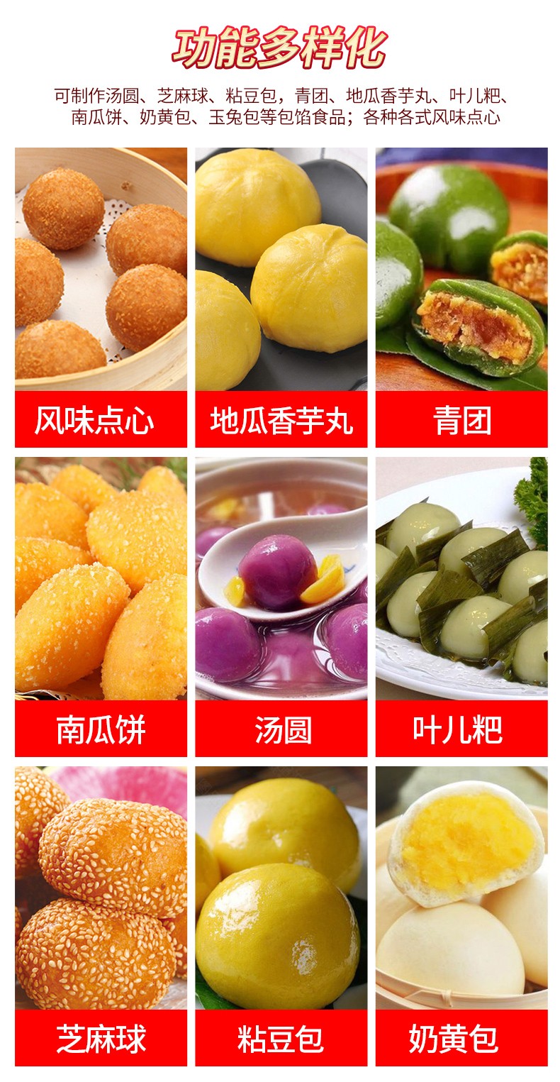 可依外皮及餡料的種類不同,可制作湯圓,芝麻球,豆沙包,南瓜餅、奶皇包、含餡饅頭、玉兔包等包餡食品;各種地方風(fēng)味小吃及各式點心。如:東北的粘豆包,江浙滬的青團,東南部的地瓜丸,香芋丸;西南的葉兒粑等等。