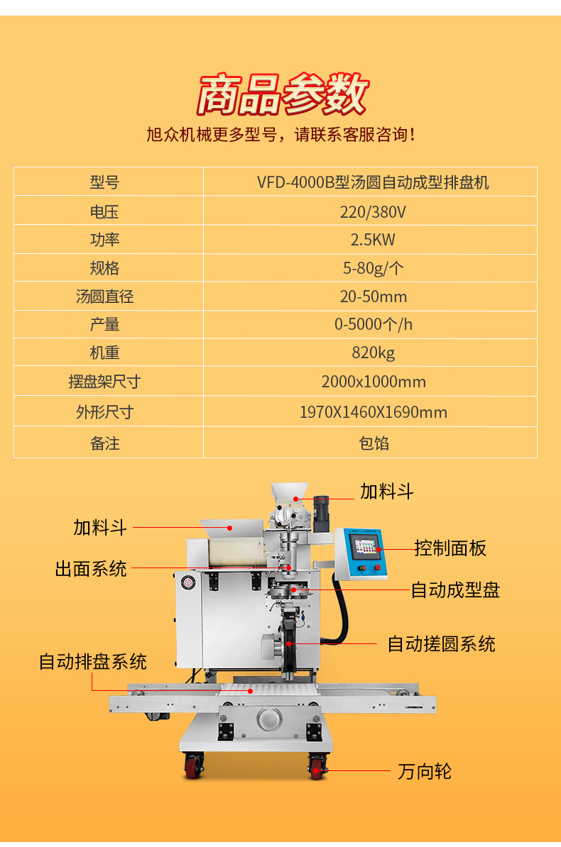 今天給大家介紹一下這款VFD-4000B型湯圓機,為什么要介紹它呢,這款機械制作多品種食品,關(guān)鍵是產(chǎn)量效率高,1小時的產(chǎn)量可達5000個,相當(dāng)于20-30個工人同時手工制作湯圓,真正的低投入,高收益,省錢省工,可制作各式包餡食品,如湯圓、豆沙包、南瓜餅等,是賓館、飯店、企業(yè)、學(xué)校、部隊等公共食堂和專業(yè)戶理想的面食機械。