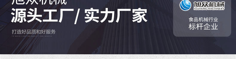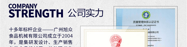 廣州旭眾食品機(jī)械有限公司是一家集科研開發(fā),生產(chǎn)設(shè)計,營銷服務(wù)為一體的現(xiàn)代化生產(chǎn)企業(yè)?,F(xiàn)代化生產(chǎn)車間,精湛制造技術(shù),所產(chǎn)機(jī)械歷經(jīng)市場重重考驗,不斷贏得海內(nèi)外客戶的贊譽(yù)。
