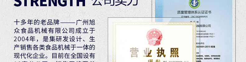 廣州旭眾食品機械有限公司是一家集科研開發(fā),生產(chǎn)設(shè)計,營銷服務(wù)為一體的現(xiàn)代化生產(chǎn)企業(yè)?,F(xiàn)代化生產(chǎn)車間,精湛制造技術(shù),所產(chǎn)機械歷經(jīng)市場重重考驗,不斷贏得海內(nèi)外客戶的贊譽。